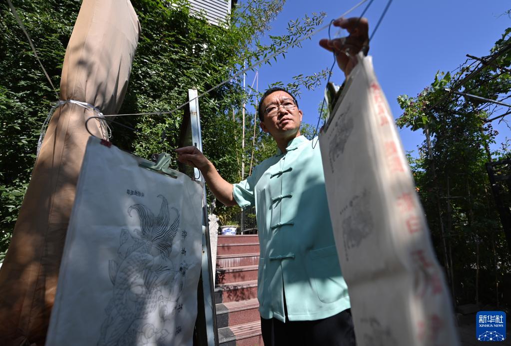 在天津市西青區的楊柳青霍氏古一張畫(huà)店,霍樹(shù)林把印好的“畫(huà)坯子”進(jìn)行晾曬(6月6日攝)。