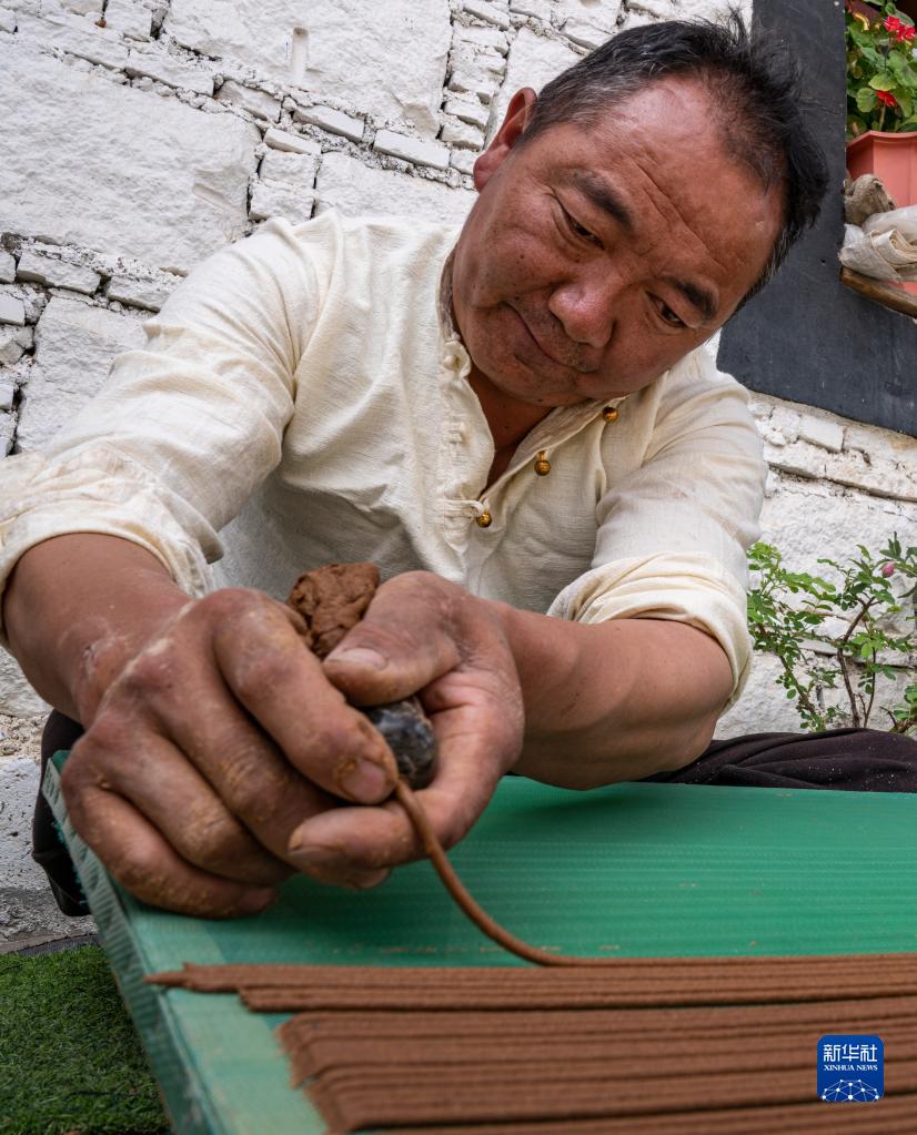 要保證每一根成型的藏香均勻且筆直,很考驗匠人的功底。為了制作合格的藏香,次仁多吉在地上一坐就是一整天,擠出的線(xiàn)香鋪滿(mǎn)房間。多年的制香經(jīng)歷,讓他在擁有出眾技藝的同時(shí),也患上了職業(yè)病——時(shí)常關(guān)節疼。但次仁多吉不僅堅持至今,還順應市場(chǎng),研發(fā)了提神香、安眠香等新品種,并擴大了生產(chǎn)規模。