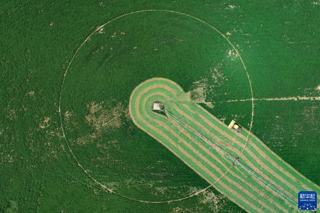 6月10日,牧草收割機在鄂托克前旗昂素鎮收獲紫花苜蓿(無(wú)人機照片)。