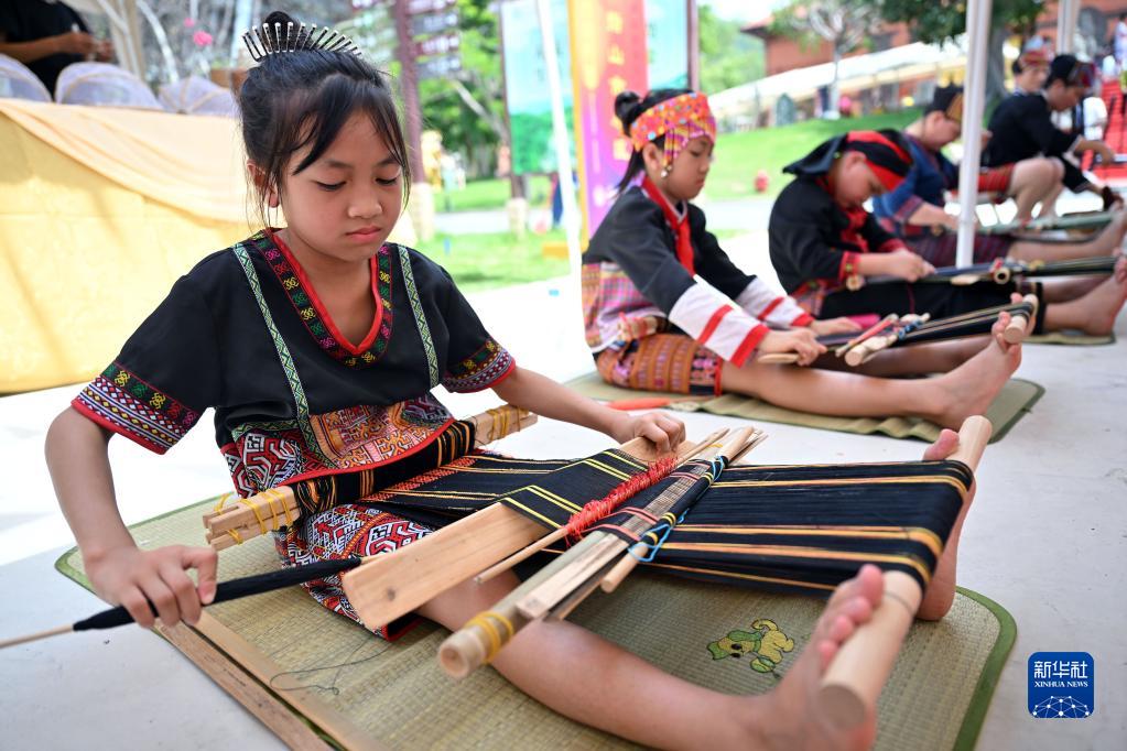 6月10日,2023年“文化和自然遺產(chǎn)日”海南省宣傳展示暨第三屆三亞南山非遺節在三亞市南山文化旅游區舉行,小朋友在展示黎族織錦技藝。