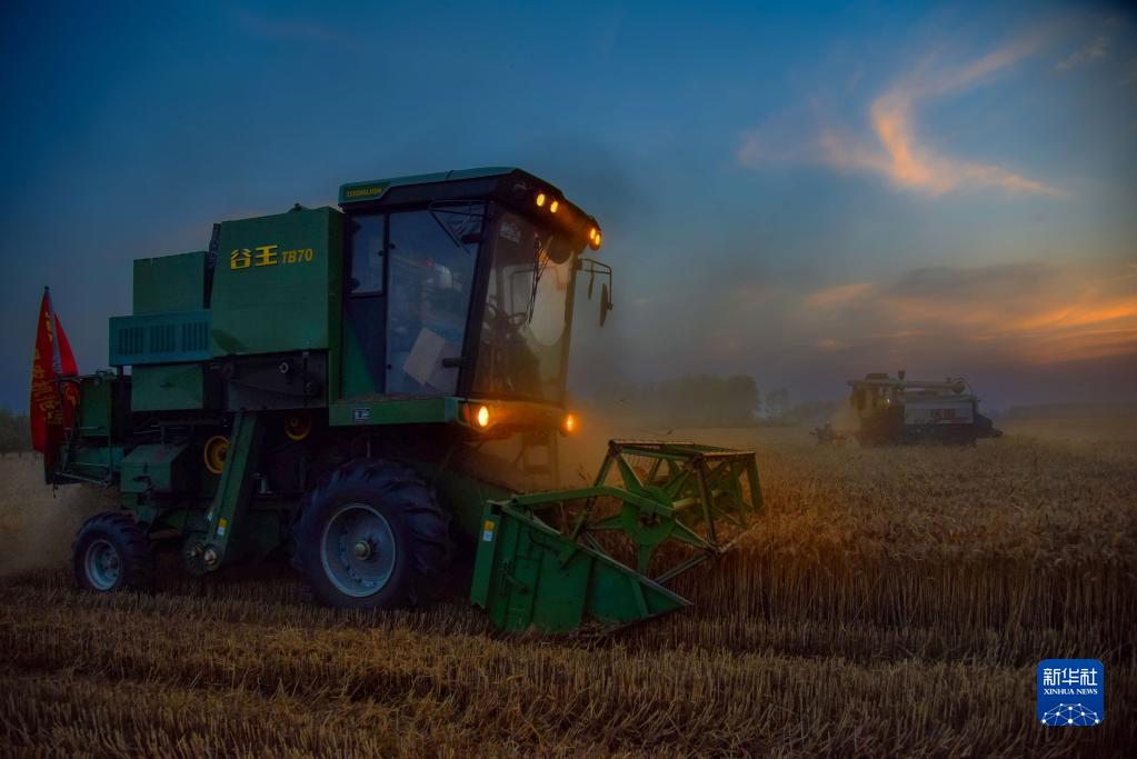 6月9日傍晚,收割機在安徽省宿州市碭山縣的麥田進(jìn)行搶收作業(yè)。