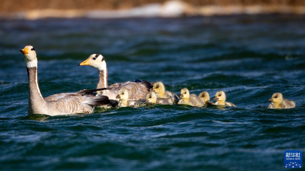 6月6日,在甘肅阿克塞哈薩克族自治縣境內的小蘇干湖濕地,斑頭雁帶領(lǐng)雁寶寶在水中活動(dòng)。