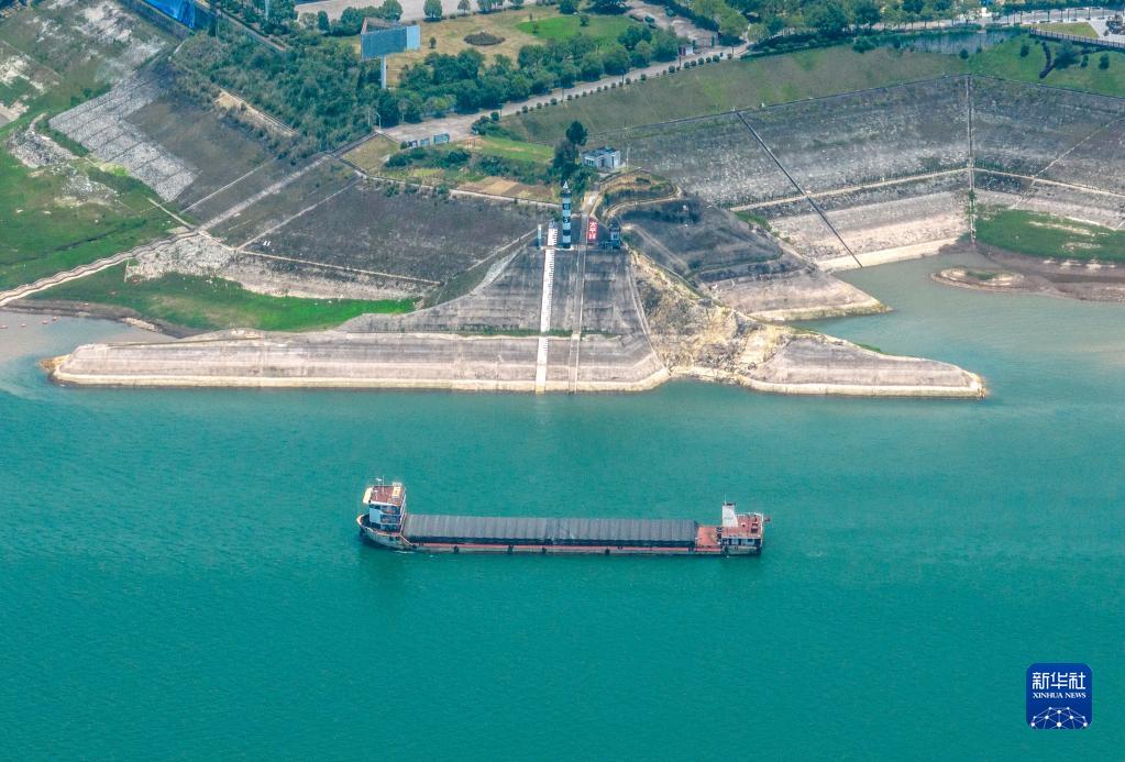6月10日,船舶從三峽大壩上游太平溪水文標尺前駛過(guò)(無(wú)人機照片)。