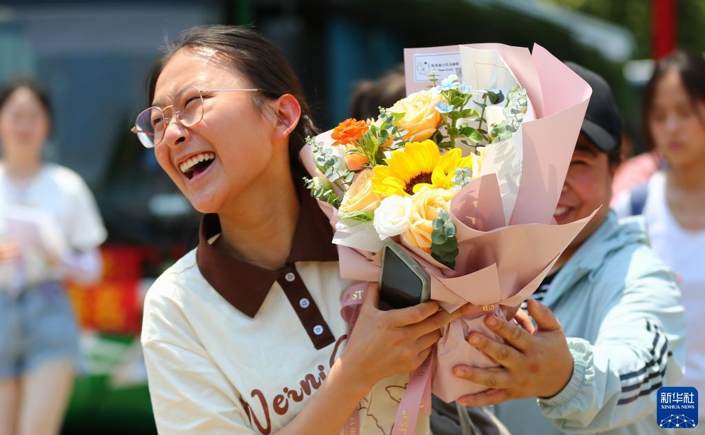 6月10日,在山東省滕州市第二中學(xué)考點(diǎn),一名考生(左)從家人手中接過(guò)鮮花。