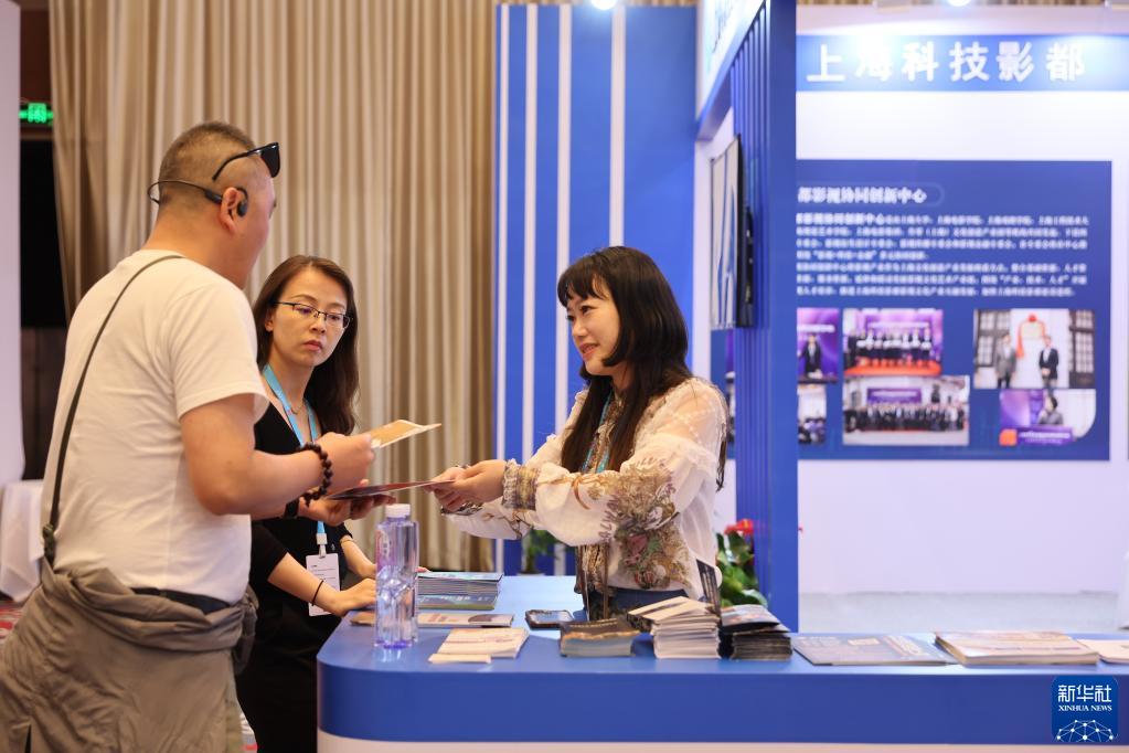 6月10日,展商在電影市場(chǎng)向咨詢(xún)者遞上宣傳冊。