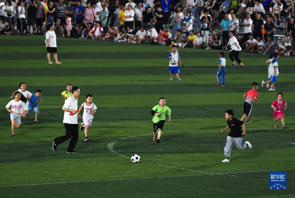 6月9日,小朋友們在貴州“村超”足球比賽半場(chǎng)休息時(shí)間上場(chǎng)踢球。