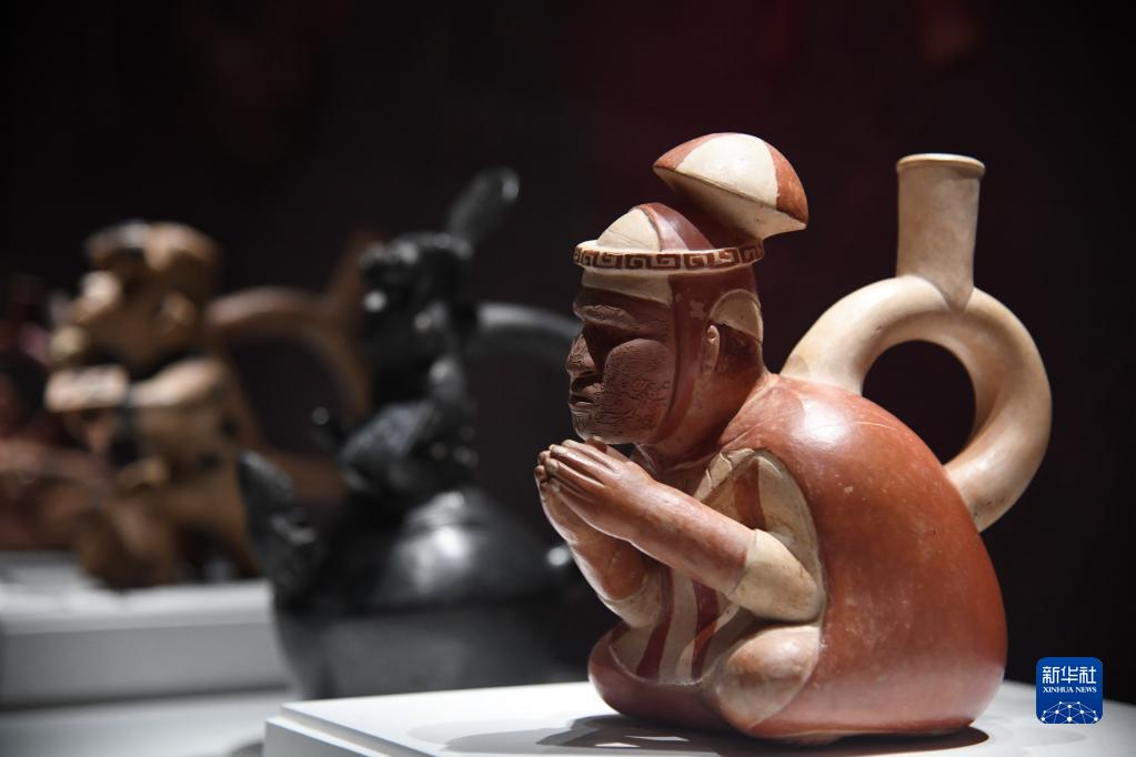 這是在陜西歷史博物館展出的秘魯文物面部雕紋的男子陶瓶(6月10日攝)。