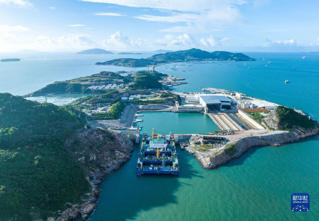 “一航津安1”號沉管運輸安裝一體船拖帶E23管節和最終接頭從珠海桂山島啟航,前往沉放水域(6月8日攝,無(wú)人機照片)。
