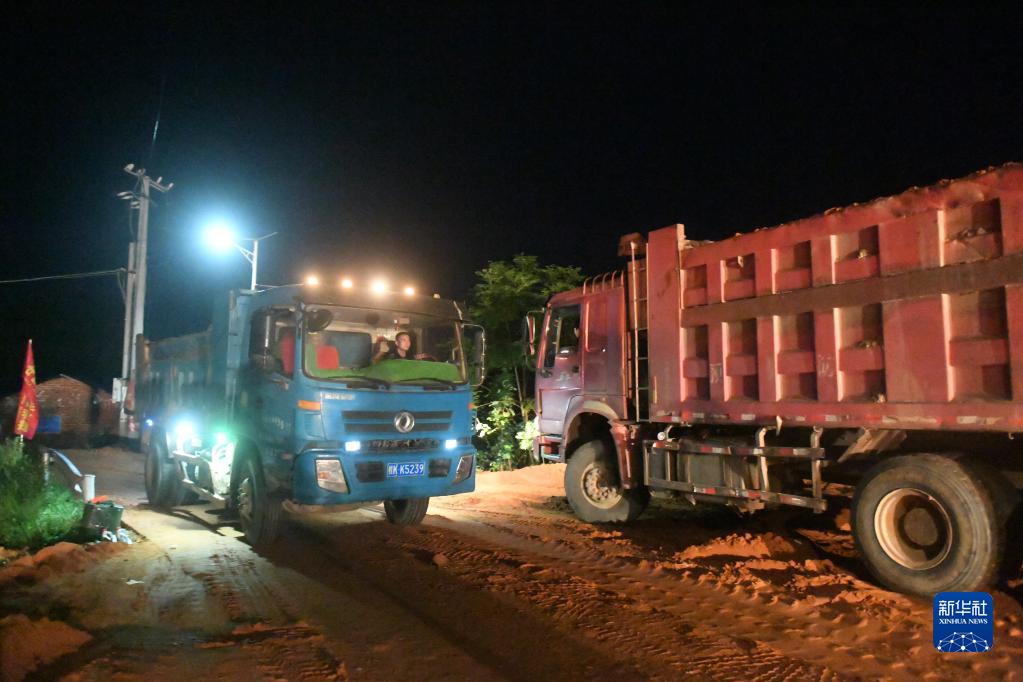 6月11日,在廣西合浦縣白沙鎮,工作人員在連夜施工修復遭受洪水損毀的堤壩。