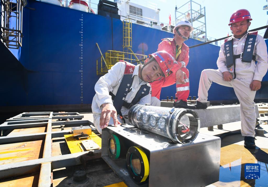 在“一航津安1”號沉管運輸安裝一體船掛載的E19沉管上,鎖旭宏(左一)跟潛水員叮囑拆解水下雙目攝影定位設備要注意的情況(2022年7月22日攝)。