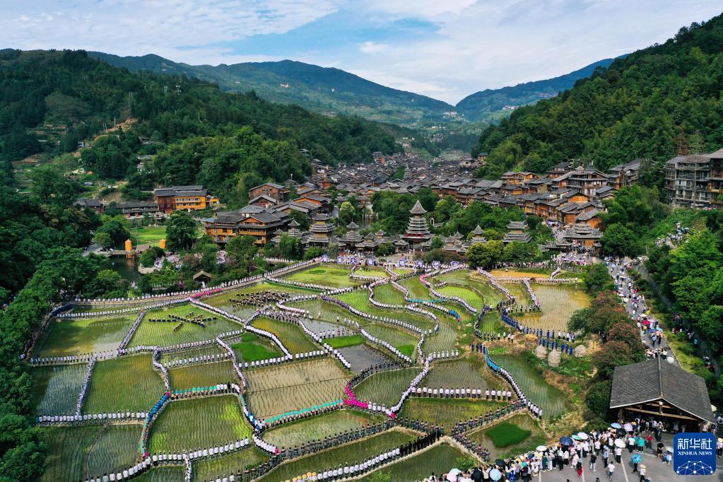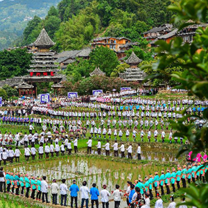 6月10日,在貴州省黔東南苗族侗族自治州黎平縣肇興侗寨,以侗寨作背景,以田園為舞臺,來(lái)自黔東南州各縣市的歌手與現場(chǎng)游客、群眾約萬(wàn)人合唱侗族大歌等歌曲,展示人類(lèi)非物質(zhì)文化遺產(chǎn)之美。