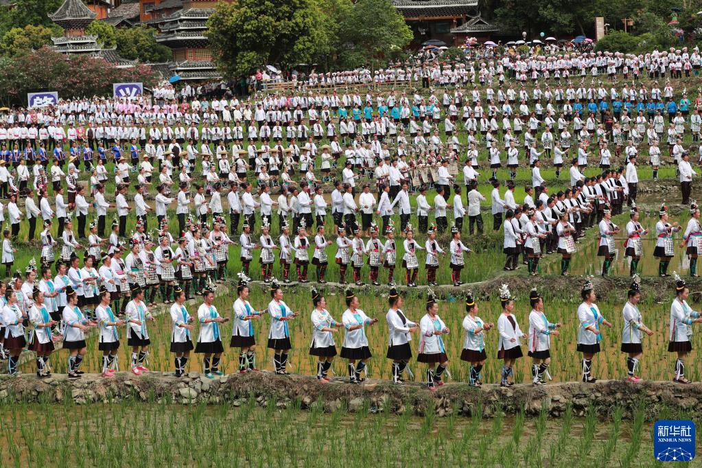 6月10日,在貴州省黔東南苗族侗族自治州黎平縣肇興侗寨,以侗寨作背景,以田園為舞臺,來(lái)自黔東南州各縣市的歌手與現場(chǎng)游客、群眾約萬(wàn)人合唱侗族大歌等歌曲,展示人類(lèi)非物質(zhì)文化遺產(chǎn)之美。