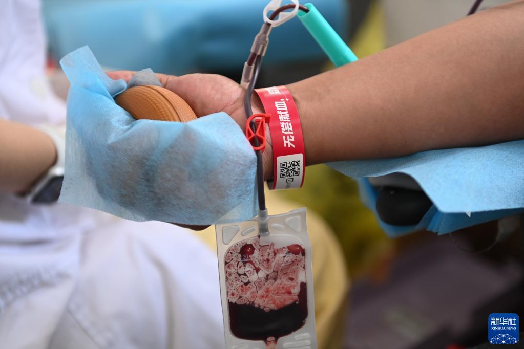 6月11日,青年志愿者在獻血車(chē)上無(wú)償獻血。