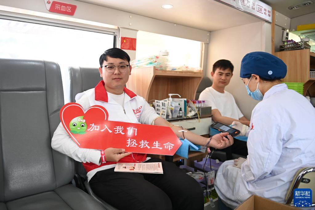 6月11日,青年志愿者在獻血車(chē)上無(wú)償獻血。