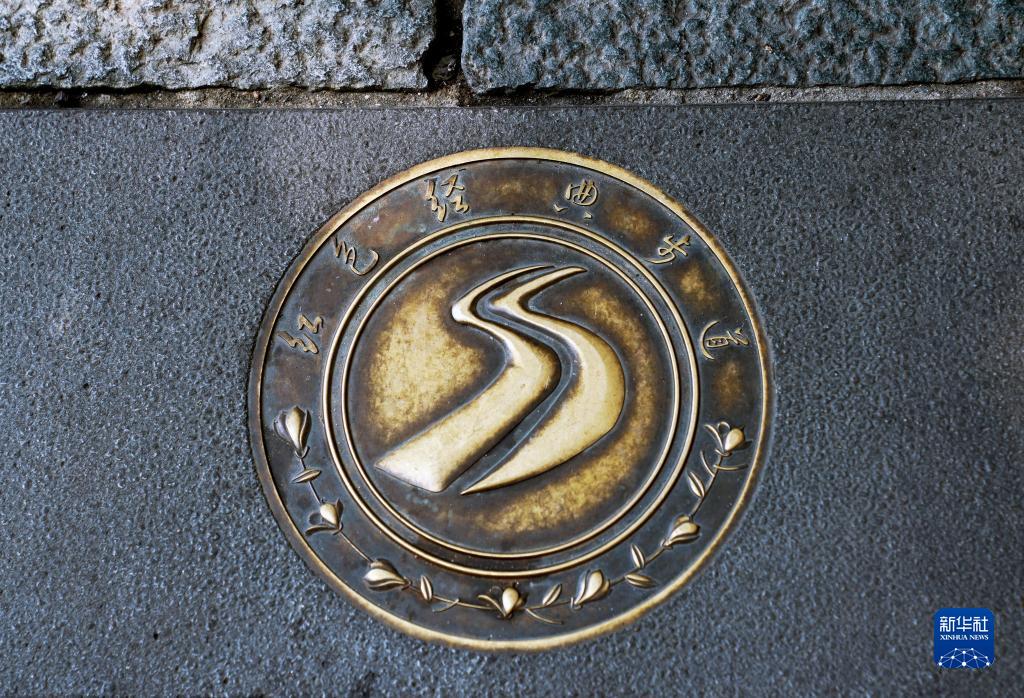 6月9日在上海市黃浦區的道路上拍攝的“紅色經(jīng)典步道”標識。通過(guò)這條步道,市民游客以中共一大會(huì )址為起點(diǎn),可以漫步至周邊的多處紅色舊跡遺址,展開(kāi)紅色之旅。