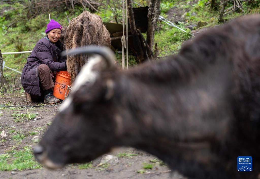 6月10日,央宗在牧場(chǎng)擠奶。