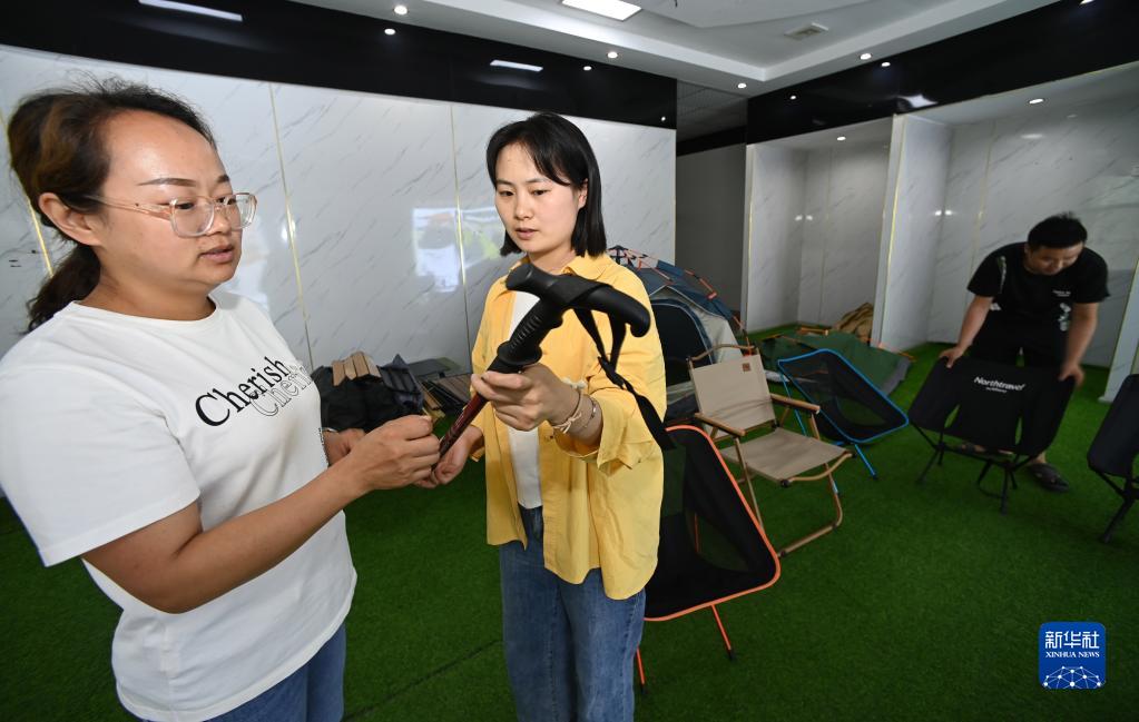 6月12日,鳳岡縣一戶(hù)外產(chǎn)品生產(chǎn)企業(yè)工作人員(中)給客戶(hù)介紹產(chǎn)品。