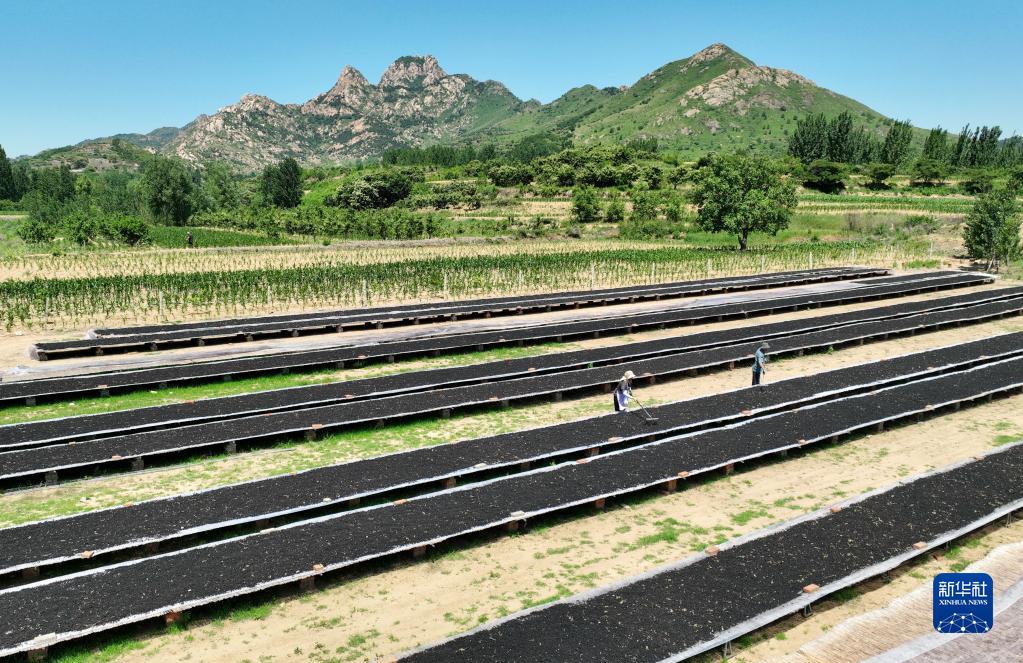 6月12日,河北省秦皇島市撫寧區墳坨鎮舊縣村的農民在晾曬用作藥材的桑葚(無(wú)人機照片)。