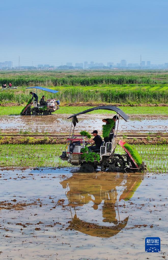 6月12日,在江蘇省連云港市贛榆區一處水稻田里,農民駕駛插秧機進(jìn)行水稻插秧作業(yè)(無(wú)人機照片)。新華社發(fā)(王健民 攝)