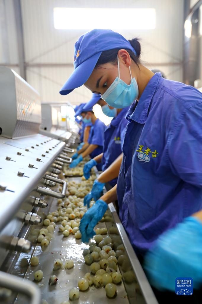 6月12日,工人們在廣東茂名的廣藥王老吉廣東荔枝(茂名)產(chǎn)業(yè)園生產(chǎn)車(chē)間工作。這里的荔枝清汁生產(chǎn)線(xiàn)每天可處理200噸荔枝鮮果。