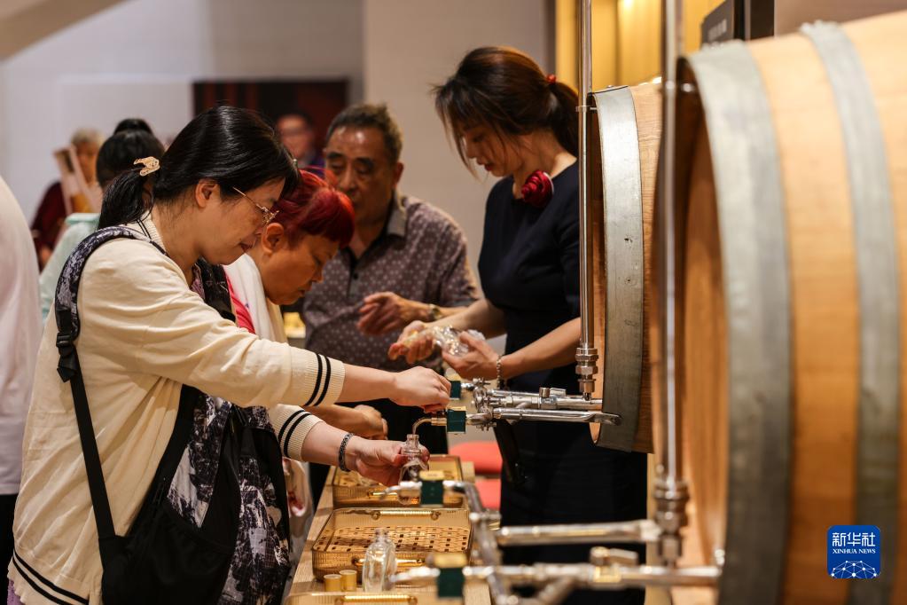 6月12日,游客在張裕酒文化博物館內體驗灌裝白蘭地酒。