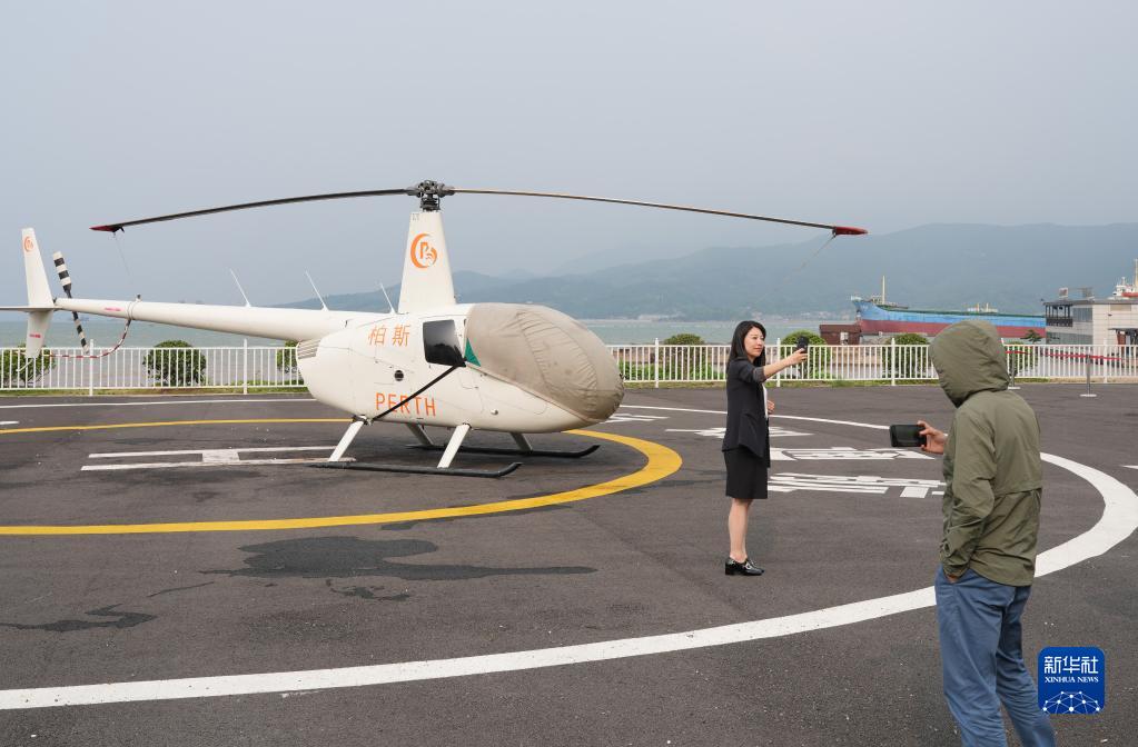 6月12日,游客在強蛟鎮一架觀(guān)光直升機前留影。