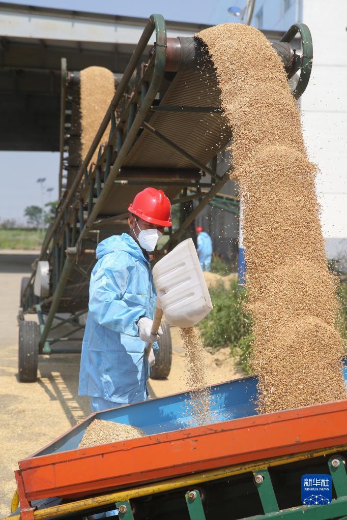 6月13日,在江蘇連云港市青口鹽場(chǎng)倉儲中心,工人用傳輸機傳送烘干后的小麥入庫。