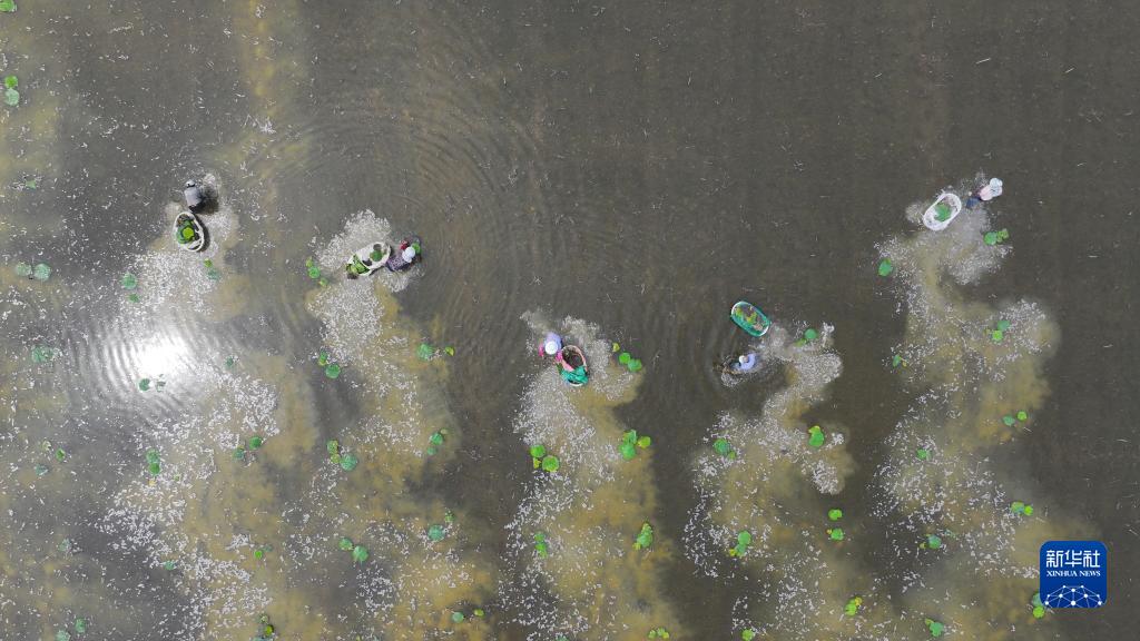 6月13日,江蘇省淮安市洪澤區岔河鎮農民在田間移栽芡實(shí)秧苗(無(wú)人機照片)。