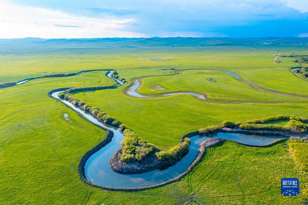 初夏時(shí)節,位于內蒙古自治區錫林郭勒盟東北部的烏拉蓋草原風(fēng)景宜人,蔚藍色的天幕下,綠色的草原廣闊無(wú)垠,蜿蜒流淌的烏拉蓋河綿延向遠方,美如畫(huà)卷。