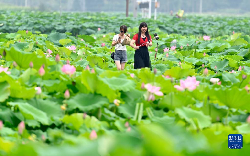 6月13日,游客在柳州市柳江區百朋鎮萬(wàn)畝荷塘里游玩。