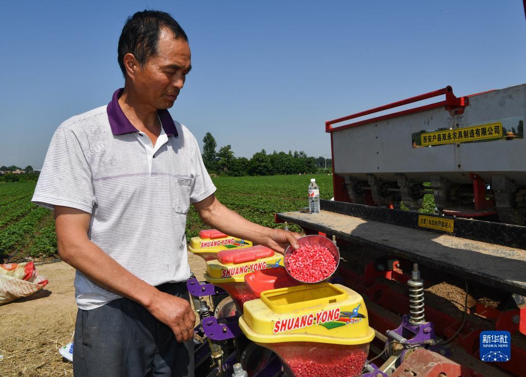 6月13日,在陜西省西安市鄠邑區五竹街道,農戶(hù)向播種機放入玉米種子。