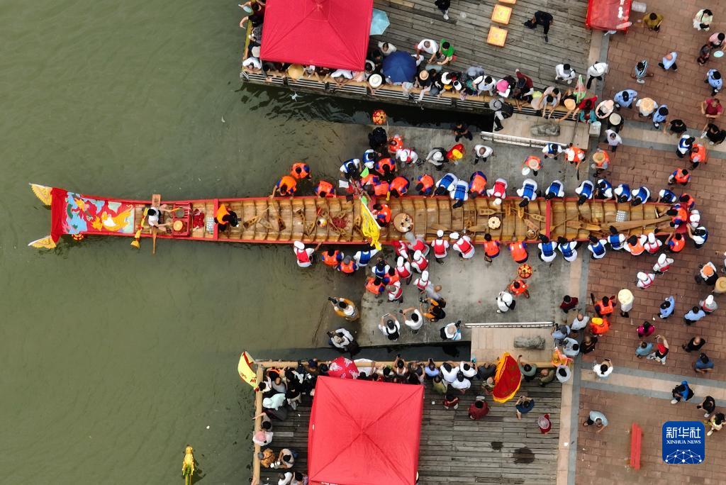 6月13日,在莆田木蘭溪畔舉行的端午節龍舟傳統祭江儀式現場(chǎng),一艘龍舟下水(無(wú)人機照片)。