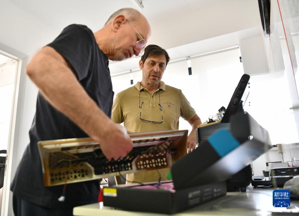 5月29日,在意大利卡斯特爾菲達多,貝爾杜納品牌總經(jīng)理弗朗切斯科·門(mén)加希尼(右)與工匠一起工作。