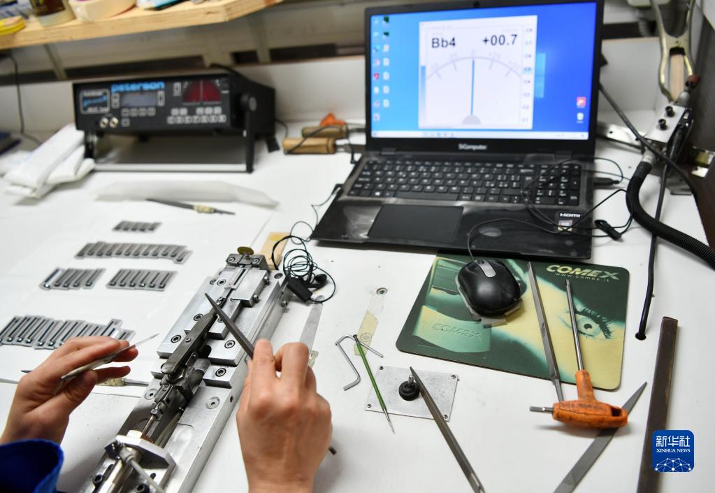 5月29日,在意大利卡斯特爾菲達多,貝爾杜納品牌手風(fēng)琴工匠對手風(fēng)琴部件進(jìn)行預調音。