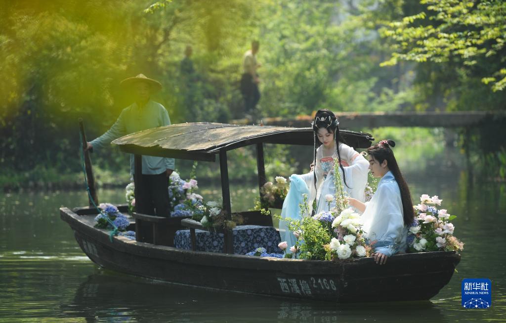 古裝演員在西溪濕地參加宋韻花朝節水上巡游(4月2日攝)。