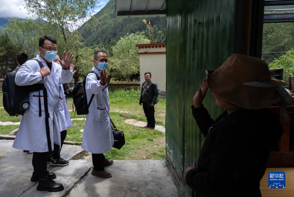 6月12日上午10點(diǎn),廣東珠海市人民醫院第七批援藏醫療隊隊長(cháng)王振疆、隊員陳冰、王彤旭和年輕的當地醫生尼瑪益西一起帶著(zhù)醫療設備和藥品,離開(kāi)西藏米林市人民醫院,驅車(chē)前往30多公里外的吞不絨村為患者進(jìn)行診療。