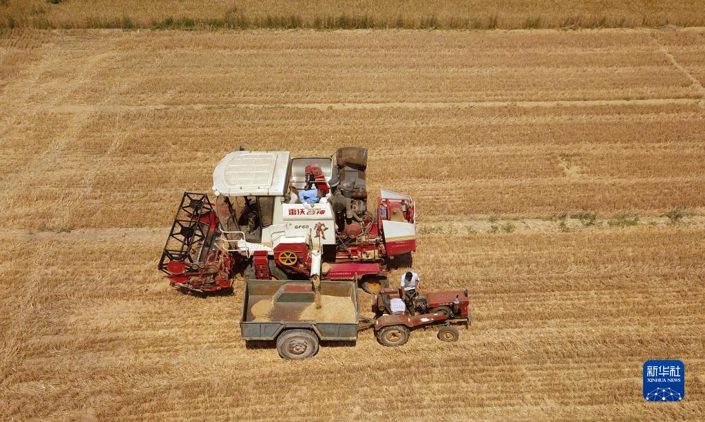 6月14日,在山東省臨邑縣林子鎮,聯(lián)合收割機在收獲小麥(無(wú)人機照片)。