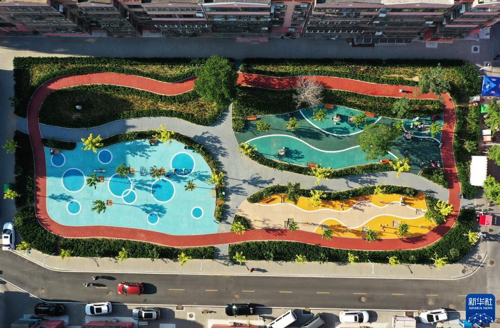 6月3日在秦皇島市海港區拍攝的一個(gè)新改造完工的小區廣場(chǎng)可透水地面(無(wú)人機照片)。