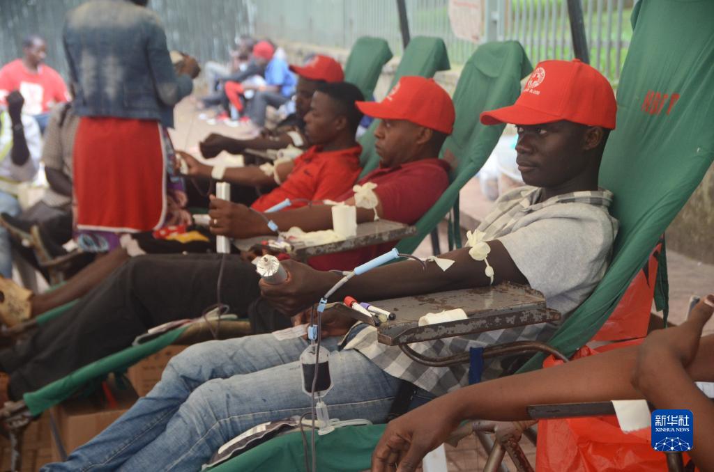 6月14日,志愿者在烏干達坎帕拉一處獻血點(diǎn)獻血。
