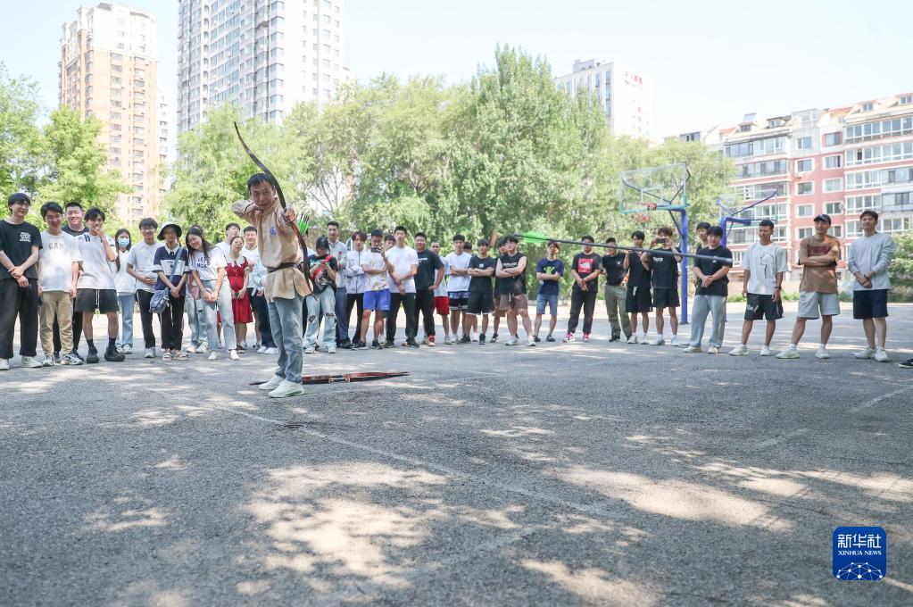6月15日,沈陽(yáng)市非物質(zhì)文化遺產(chǎn)項目——錫伯族弓箭傳統制作技藝的傳承人鄂建燁在沈陽(yáng)師范大學(xué)為學(xué)生示范傳統弓箭射箭動(dòng)作。