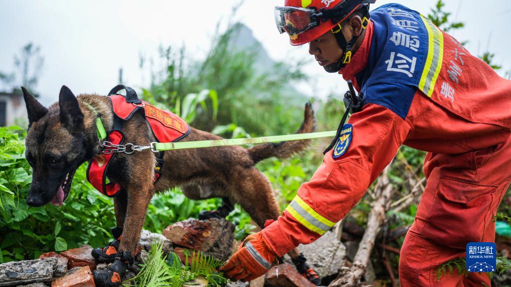 6月15日,六盤(pán)水市消防救援支隊隊員在指揮搜救犬進(jìn)行搜索。