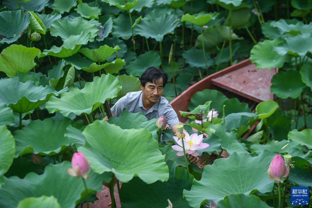 6月16日,東林鎮泉心村村民劃著(zhù)船采收荷花、荷葉。該村利用水鄉荷塘、河道優(yōu)勢,積極發(fā)展特色旅游和休閑農業(yè),助力共同富裕。