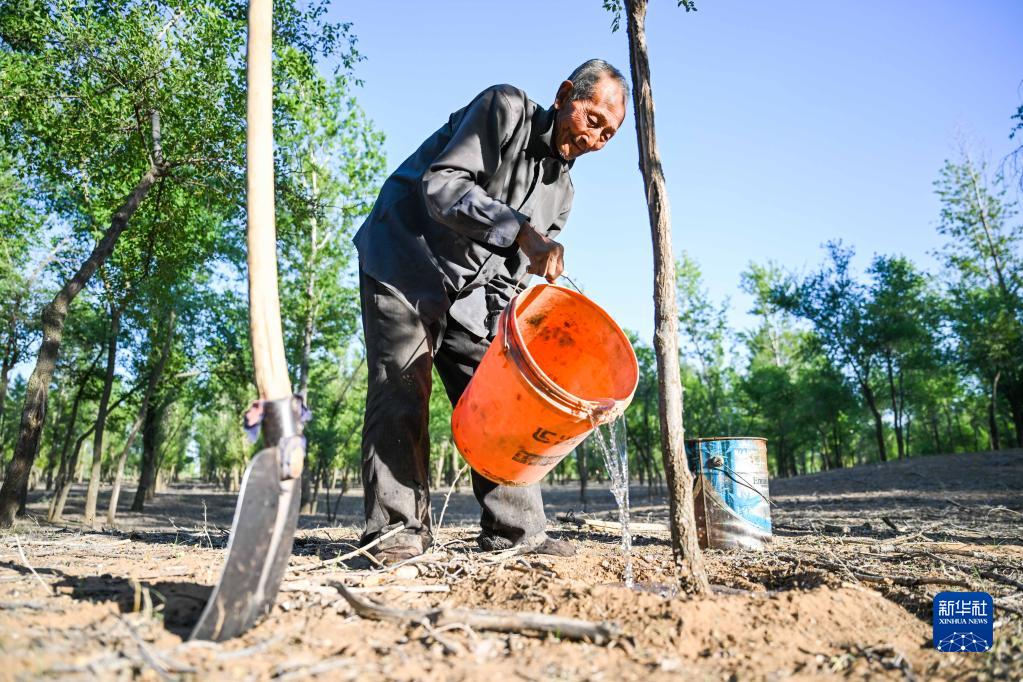 6月14日,曹扎娃在給樹(shù)苗澆水。