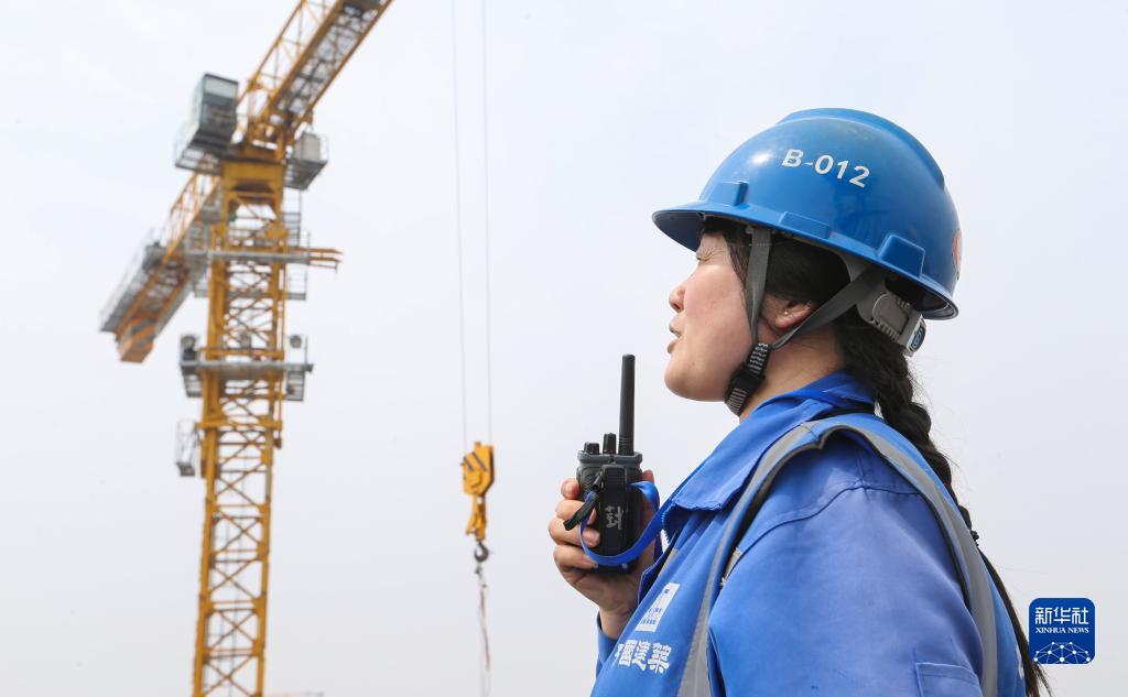 6月16日,在江蘇連云港市徐圩新區中化連云港循環(huán)經(jīng)濟產(chǎn)業(yè)園罐區二期項目施工現場(chǎng),工人在指揮塔吊運轉建筑材料。