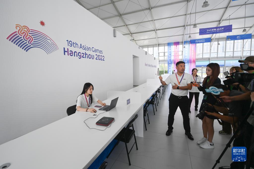 6月16日,工作人員在杭州亞運村歡迎中心介紹服務(wù)流程。歡迎中心包含代表團歡迎中心、媒體中心和訪(fǎng)客中心三個(gè)部分,其中代表團歡迎中心是所有代表團抵達亞運村的第一站,將提供24小時(shí)全天候服務(wù)。