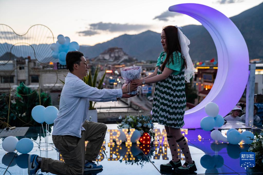 在八廓街附近的一家餐廳樓頂舉行的求婚儀式(6月7日攝)。