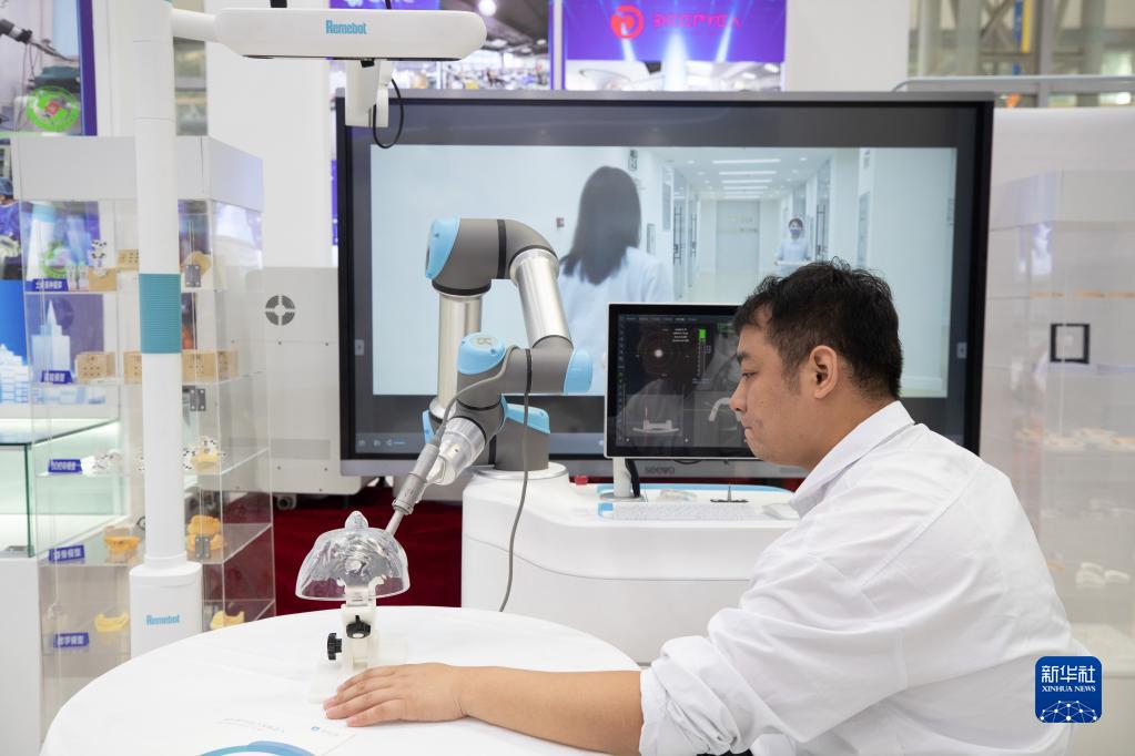 6月16日,參展商在現場(chǎng)操控口腔手術(shù)機器人。