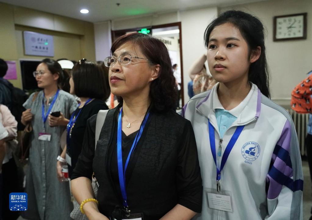 6月16日,考生代表(右一)在位于清華大學(xué)的高考數學(xué)評卷點(diǎn)參觀(guān)。