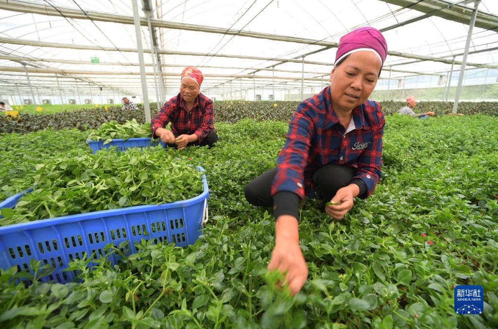 6月16日,村民在貴州省黔東南苗族侗族自治州黃平縣舊州鎮野菜種植基地采收野菜田七葉。