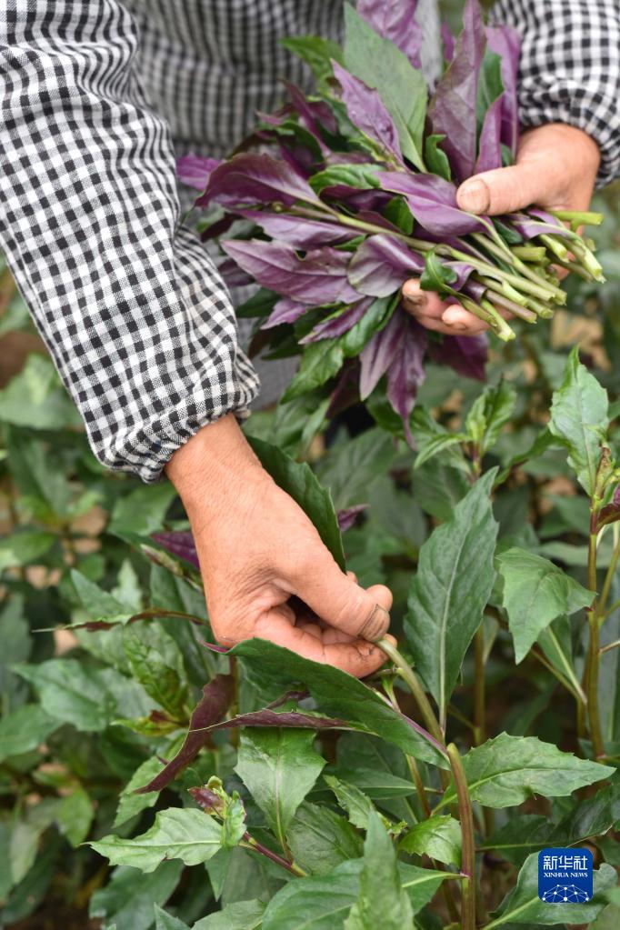 6月16日,村民在貴州省黔東南苗族侗族自治州黃平縣舊州鎮野菜種植基地采收野菜紫背天葵。